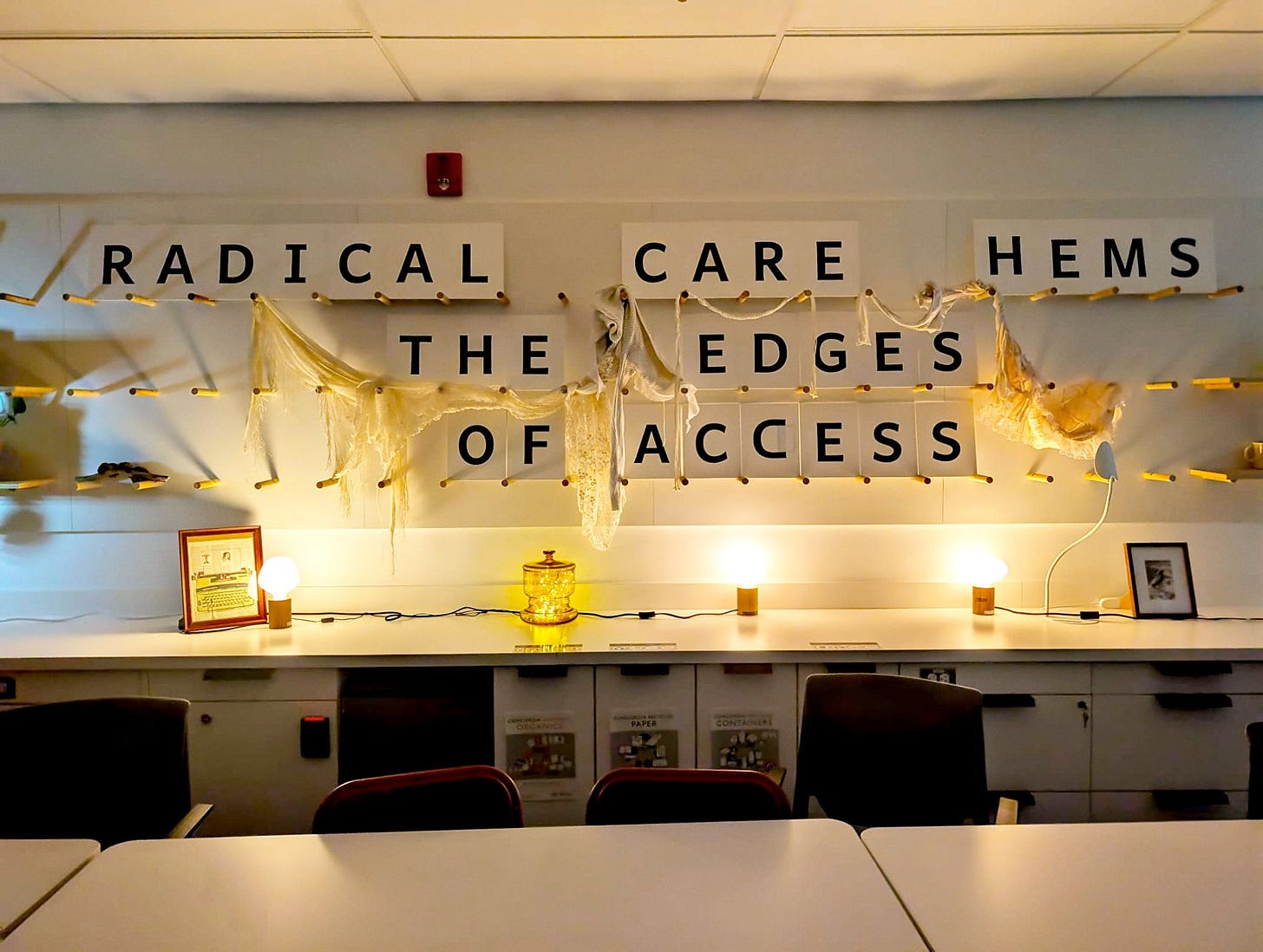 As an ongoing project at AIM Lab, we started a monthly communication board project where members can install a quote and use the wall to curate a message. For the first round, AIM Lab Member Nicholas wrote his quote “RADICAL CARE HEMS THE EDGES OF ACCESS.” Grounded in his research on young carers and the Lab’s values, the quote frames care and access as everyday, collective work shaped by young carers’ lived realities.